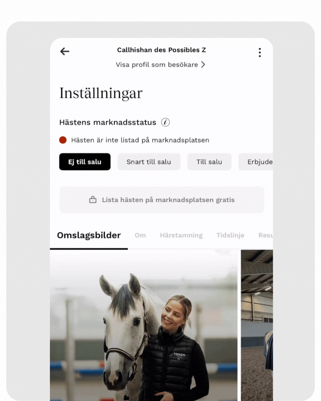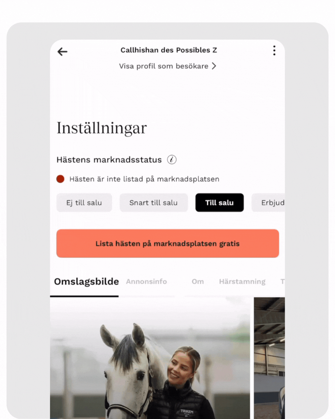 ✅️ Registrera hästen ✅️ Välj marknadsstatus ✅️ Publicera på marknadsplatsen.
